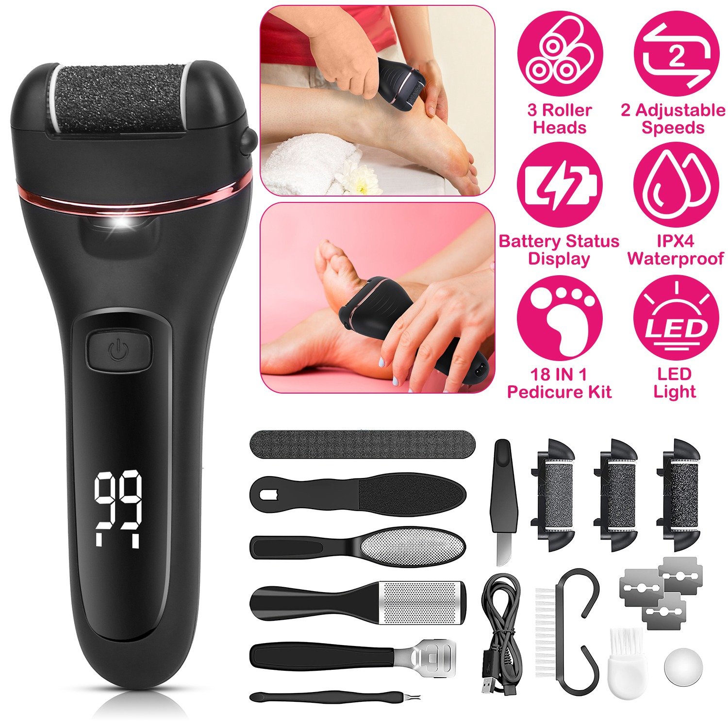 Home > Electric Foot Callus Remover Foot Grinder Rechargeable Foot File Dead Skin Pedicure Machine w/ 3 Roller Heads 2 Speeds 18 in 1 Foot Care Tool